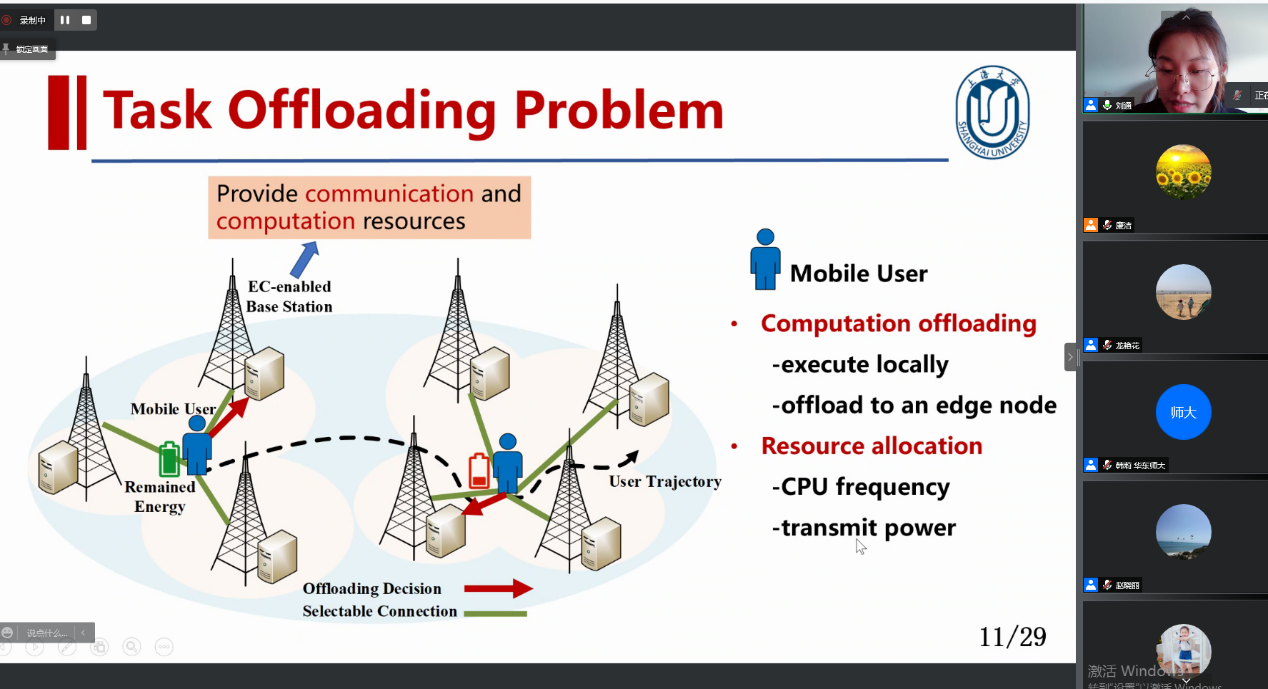上海大學劉通副教授作報告“深度強化學習在邊緣智能中的應用”,介紹了如何運用前沿的深度強化學習理論與算法解決邊緣計算中的服務部署和計算卸載問題。