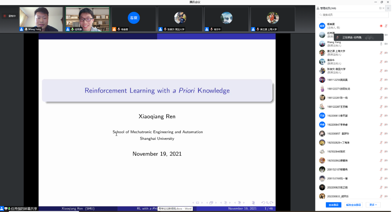 上海大學的任肖強教授作報告“融入先驗知識的強化學習”,介紹了未知通信信道數據的遠程狀態估計器的調度設計和在不規則環境下的抓取的快速學習。