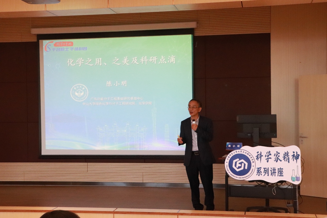 11月23日下午,化學與材料科學學院“科學家精神”系列首場講座在奉賢校區科技樓B301舉行。本次講座特邀中國科學院院士陳小明以“化學之用、之美及科研點滴”為主題,帶領同學們領略生活和科研中的化學之美,引領大家在做科研的道路上踏出堅實的一步。講座由院長楊仕平主持,學院150多名師生參加本次講座。