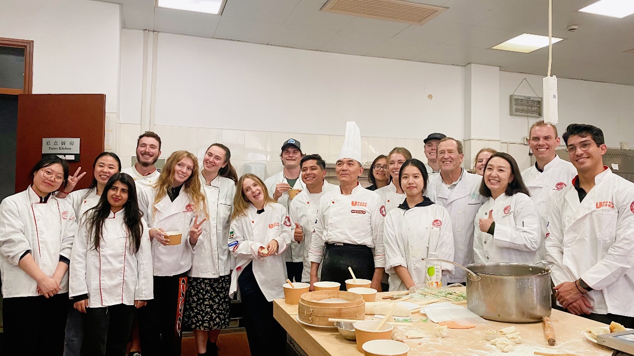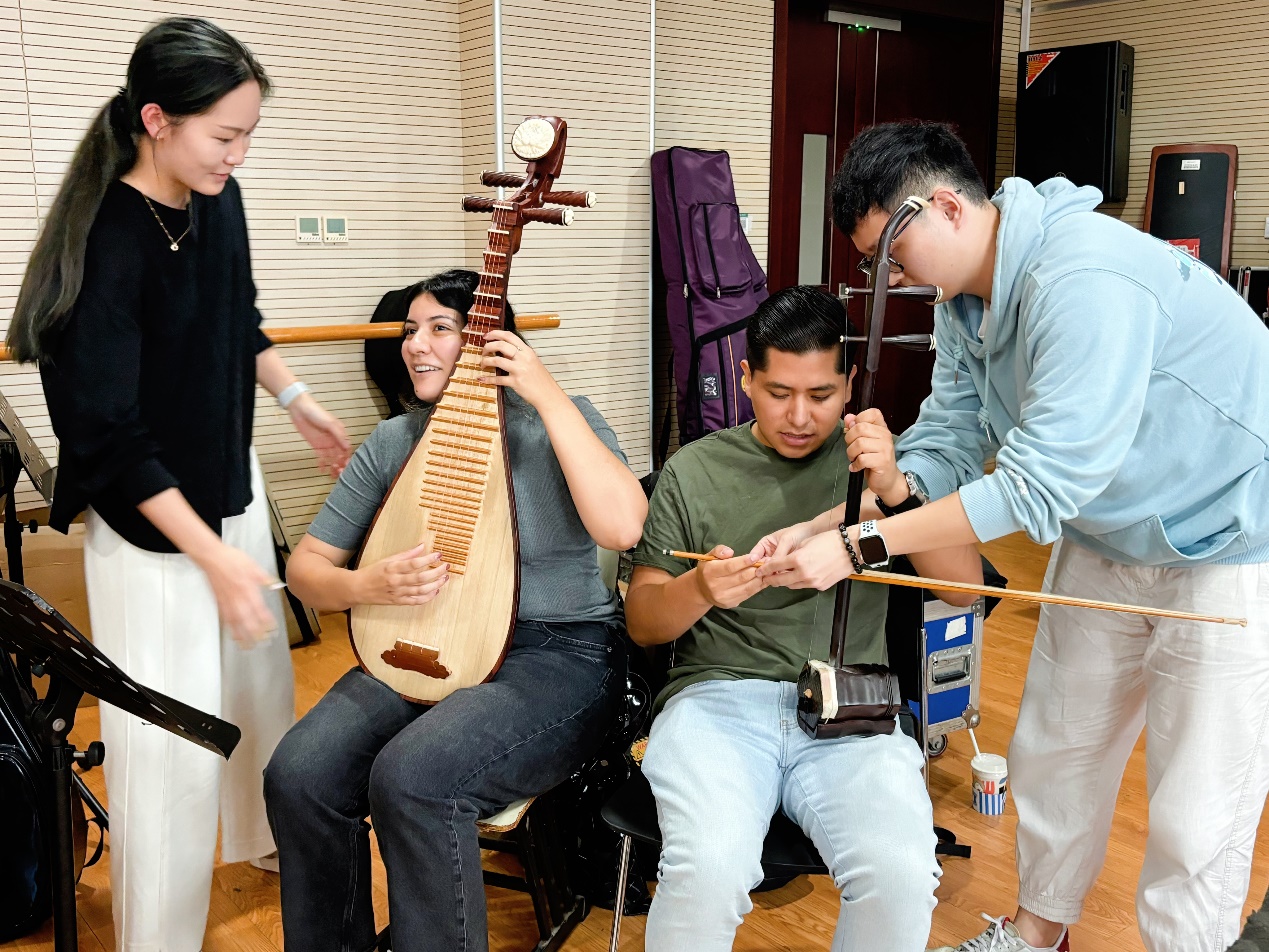 美國留學生游學團隊還在上海師范大學開展了豐富多彩的文化交流活動。11月13日,商學院與上海師范大學旅游管理學院攜手合作,為美國師生提供了“包餃子”的體驗活動。在上師大師生的耐心指導下,留學團隊學習了餃子的歷史淵源與文化寓意,親手制作的餃子更是承載著對中華傳統文化的深刻感悟與美好記憶。11月15日下午,上海師范大學音樂學院的優秀學生現場演奏中國傳統民族樂器,為游學團隊帶來了一場視聽盛宴。同時,學院師生現場教學基本的民族樂器演奏技巧,讓游學團隊的留學生們有機會親身體驗中華傳統音樂的魅力。