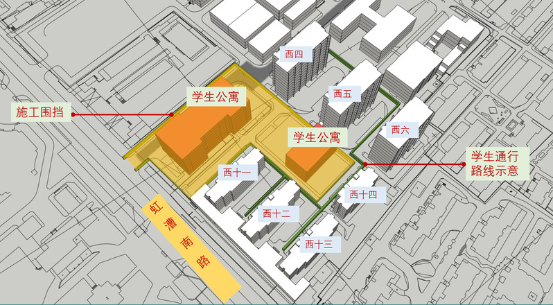 四、交通安全出行:工程施工期間,西部校區虹漕南路西門將關閉,新建學生公寓周邊區域交通組織方案有所調整,請施工區域附近住宿學生根據學生通行路線示意圖通行,西十四、西四、西五、西六宿舍學生沿宿舍樓東側道路通行,西十一、西十二、西十三宿舍學生需沿學舍路往南方向,繞行至西六宿舍樓東側道路通行(如圖所示);科創實驗樓、35kv用戶站施工通道在第二教學樓北面,為東西向,請經過此通道的學生,注意安全。