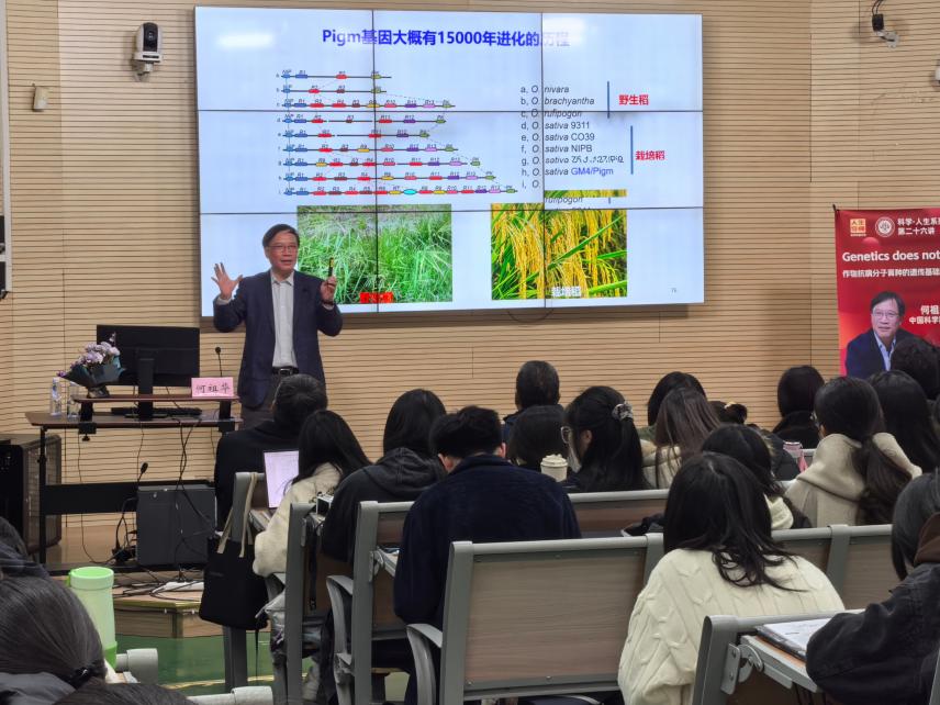 在講座中,何祖華院士從“農(nóng)作物的起源”“作物育種的發(fā)展”“我國農(nóng)作物病蟲害現(xiàn)狀與我國糧食安全”“植物與病原菌的軍備競賽”“作物抗病核心種源創(chuàng)制與育種應(yīng)用”等五個方面與大家進行了分享。在“農(nóng)作物的起源”部分,何祖華院士的分享充分展現(xiàn)了農(nóng)業(yè)科學(xué)領(lǐng)域所蘊含的深厚歷史人文底蘊。在“作物育種的發(fā)展”部分,何祖華院士詳細(xì)介紹了作物育種科學(xué)近百年來的發(fā)展歷程,及以“智能設(shè)計育種”為代表的未來作物育種方向。作為長期從事作物抗病研究的學(xué)者,何祖華院士利用詳實的數(shù)據(jù)與真實的案例為大家解讀了“我國農(nóng)作物病蟲害現(xiàn)狀與我國糧食安全”的問題,使在場師生更好理解了“農(nóng)作物病蟲害綠色防控是國家重大戰(zhàn)略決策”的重大命題。接著,何祖華院士巧妙化用“軍備競賽”的過程,生動形象地講解了植物如何抵抗病原菌這一有趣的科學(xué)問題。同時,何祖華院士結(jié)合自身近40年的科研工作經(jīng)歷,為大家展示了“作物抗病核心種源創(chuàng)制與育種應(yīng)用”的相關(guān)研究成果,并做出了“一個優(yōu)異基因就是農(nóng)業(yè)新質(zhì)生產(chǎn)力”的科學(xué)判斷。