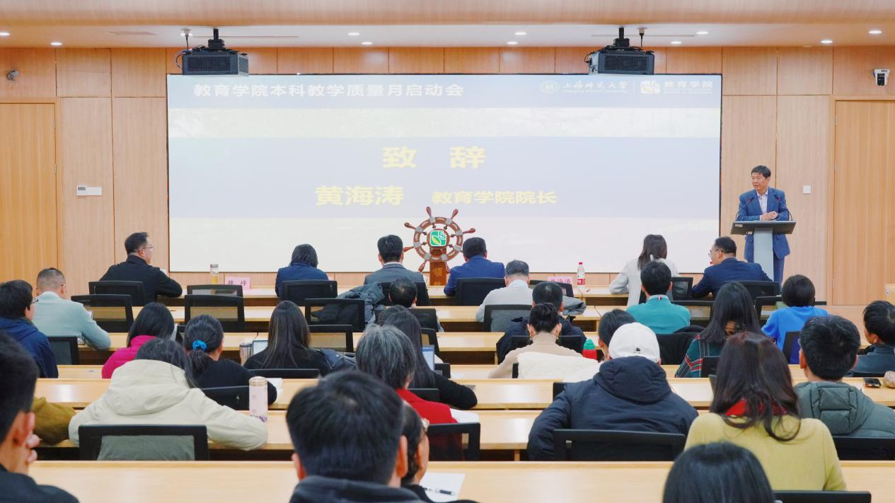 教育學院院長黃海濤在致辭中表示,本科教育教學審核評估和師范專業論證的圓滿完成,不僅是教育部對我校本科教學工作的全面肯定,也是對學院本科教學質量的認可。黃海濤強調,立德樹人始終是學院工作的根本遵循,持續提升人才培養質量一直是學院辦學的核心使命;通過本科教學質量月活動,學院對本科專業建設和教學質量保障進行細致梳理和深刻反思,教學工作從“單一專項”轉向“整體統籌”,即“教學、教材、教改和教學成果”四教合一,系統設計、整體推進,為高質量育人提供有力的組織保障。