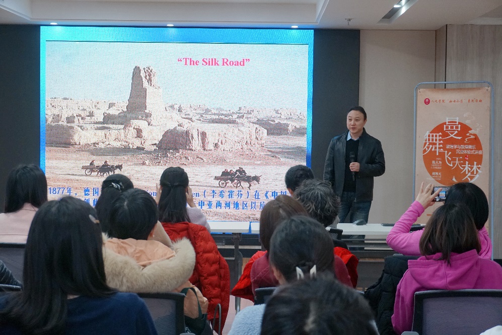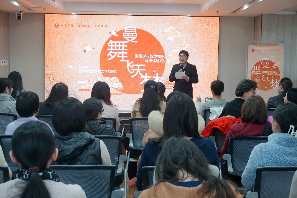 11月29日中午,人文學院“婦女小家”活動“曼舞飛天夢——敦煌學與敦煌舞樂沉浸體驗式講座”在徐匯校區文苑樓402室開展。此次沉浸體驗式講座特邀人文學院歷史系教授、博士生導師陳大為,我校舞蹈協會指導老師胡寒天分別帶來敦煌學研究成果介紹及敦煌舞沉浸式教學體驗。講座由人文學院工會主席董大學老師主持,來自人文學院和我校舞蹈協會的多位教職工參與此次活動。