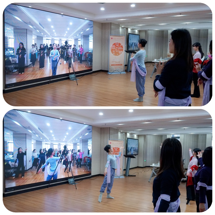 隨后,活動進入高潮——敦煌舞沉浸體驗環節。在胡寒天老師的指導下,參與講座的老師們親身體驗了敦煌舞的基本手勢與步伐。大家手臂系著組織方提前準備的彩色披帛,隨著音樂的節奏緩緩起舞,在指導老師的耐心講解下,大家逐漸找到了舞蹈的感覺,雖然動作略顯生疏,但那份對美的追求與對傳統文化的熱愛卻溢于言表。