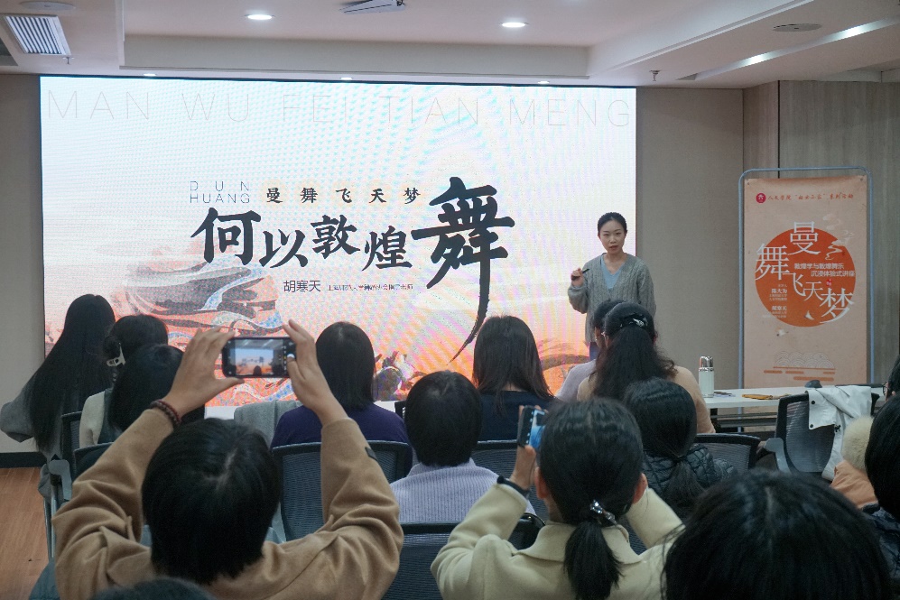 緊接著,胡寒天老師從“敦煌舞的由來”和“敦煌壁畫為敦煌舞蹈帶去的舞姿靈感”兩個方面為大家講解敦煌舞的知識,并以其精湛的舞藝現場演繹了一段經典的敦煌舞片段,舞者身姿曼妙,手勢靈動,將敦煌壁畫中反彈琵琶等飛天樂伎形象生動再現,讓在場的每一位老師都為之贊嘆。