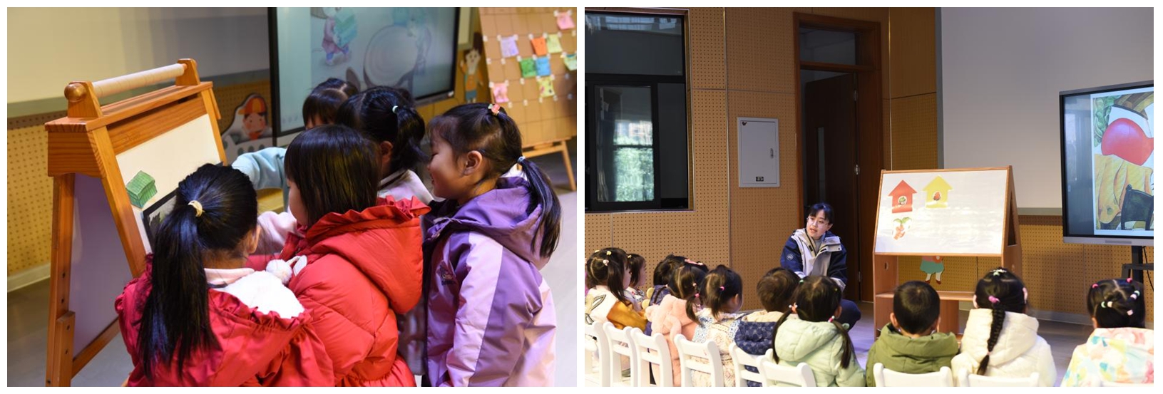 接著,蔡佳雯、楊劉青兩位老師攜手中班與小班的孩子們?yōu)閷W(xué)院師生帶來了公開課展示。蔡佳雯老師通過《冬天來了》繪本故事教學(xué),讓孩子們了解了中國二十四節(jié)氣中的立冬,在弘揚傳統(tǒng)文化的同時激發(fā)幼兒的好奇心和探索欲。楊劉青老師分享了《小兔的蘿卜》這則故事,讓孩子們體會到了朋友之間彼此分享的樂趣和意義,小班的幼兒們樂在其中。兩位老師別出心裁的課程設(shè)置和獨具匠心的教具準備,無不體現(xiàn)著她們對于幼兒教師崗位的熱愛。通過對集體教學(xué)的觀摩,學(xué)生也對未來的就業(yè)有了更明確的規(guī)劃。