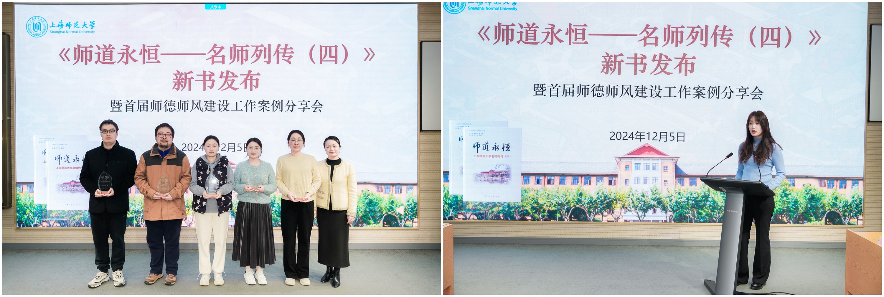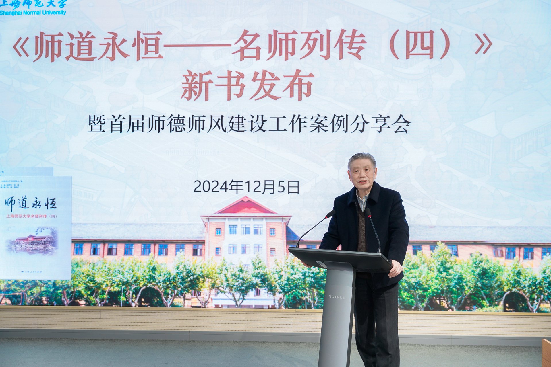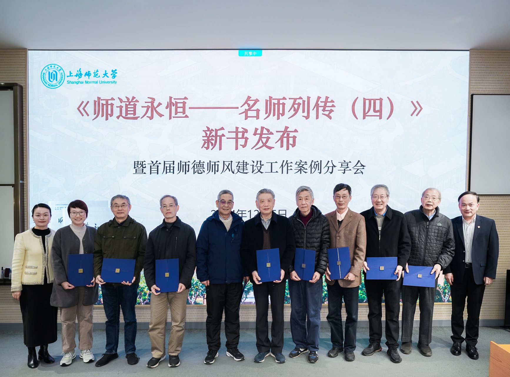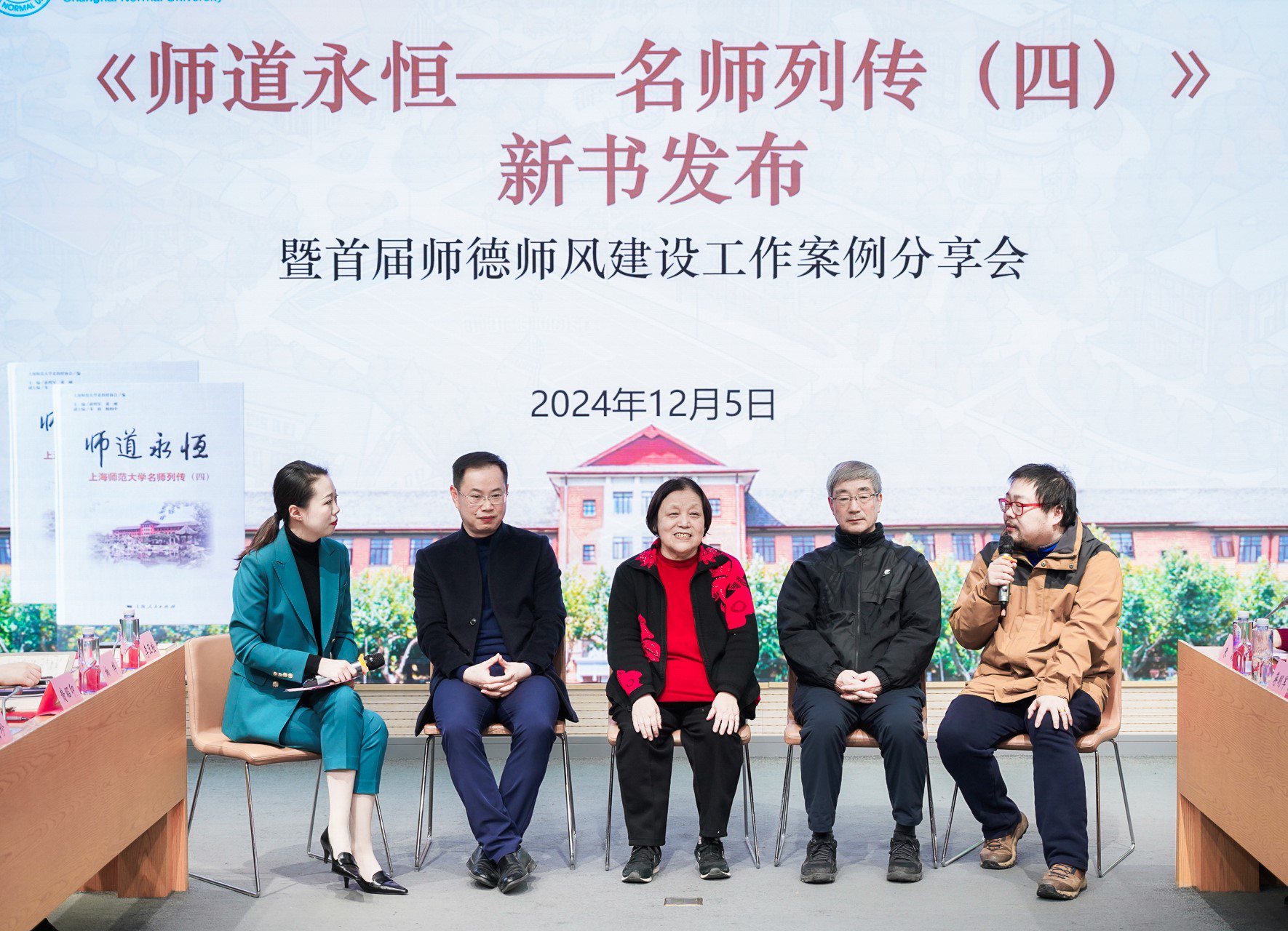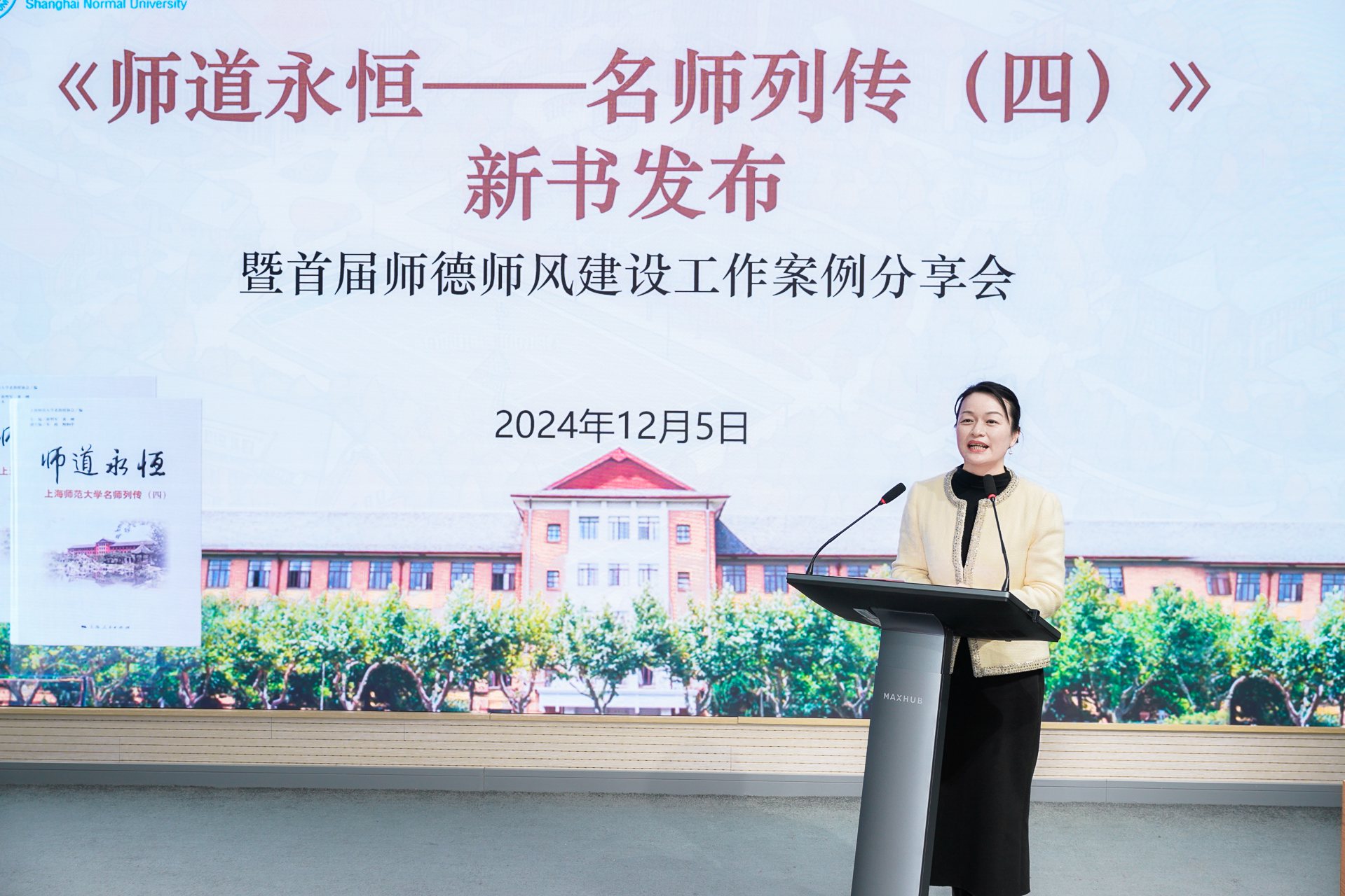 12月5日下午,學校召開《師道永恒——上海師范大學名師列傳》(四)新書發布暨首屆師德師風建設工作案例分享會。校黨委副書記楊海燕,副校長、《師道永恒(四)》主編蔣明軍,校老教授協會會長、校關工委常務副主任、《師道永恒(四)》主編黃剛,《名師列傳》(四)編委會成員、傳主代表、相關職能部門負責人、撰稿者代表、青年教師代表和學生代表出席分享會。青年教師姜杉主持。