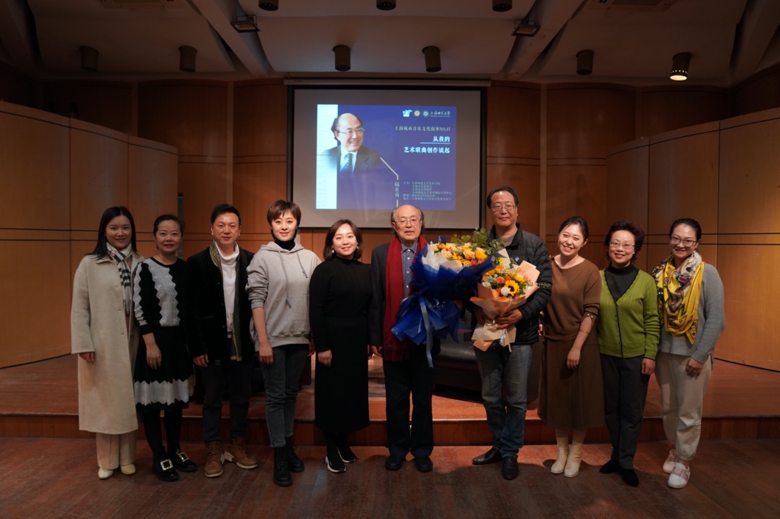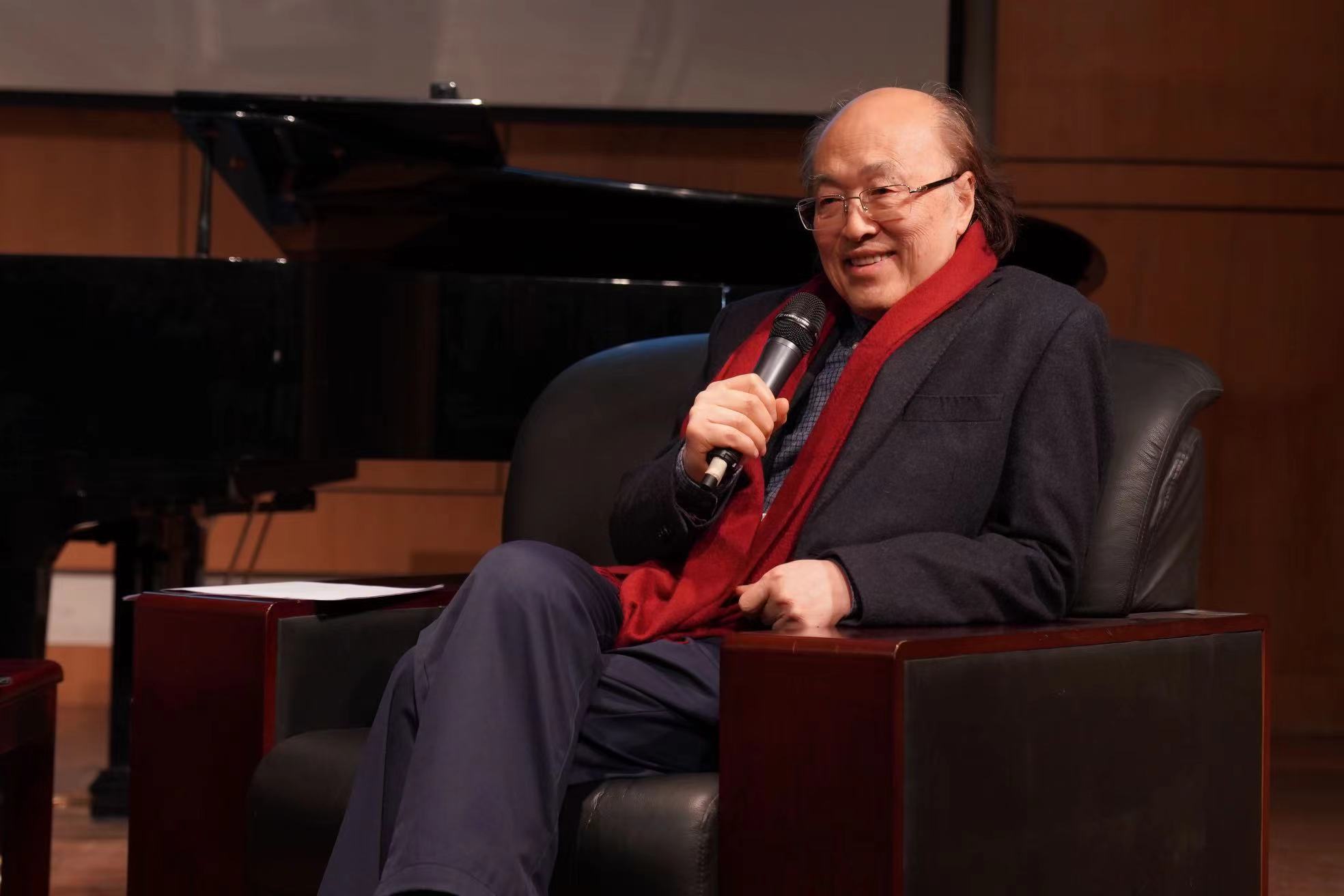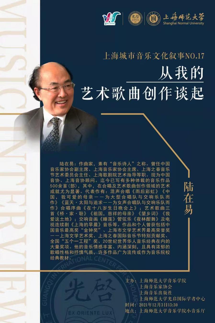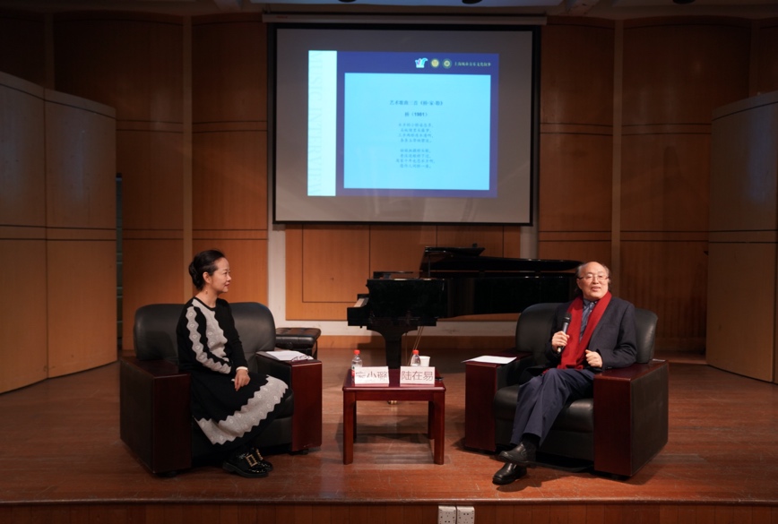 依托2021文教結合項目,音樂學院舉辦“光啟音樂大講堂—上海城市音樂文化敘事”系列訪談活動。12月3日下午,原中國音樂家協會副主席、上海音樂家協會主席、上海之春音樂節藝術委員會主任、上海歌劇院藝術指導,現中國音協、上海音協顧問,素有“音樂詩人”之稱的作曲家陸在易先生應邀蒞臨音樂學院小音樂廳,漫談“上海城市音樂文化敘事”。