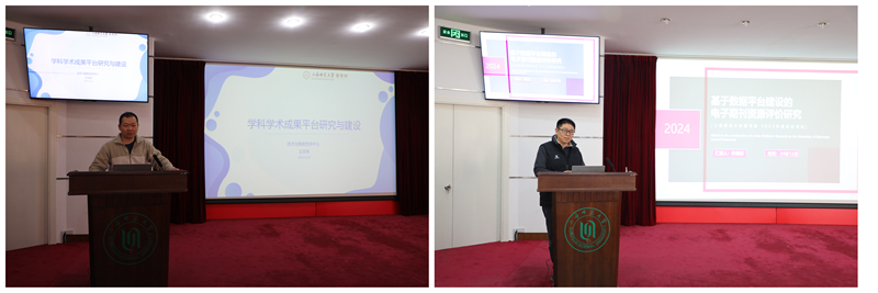 王宗亮、許繼新兩位老師作為館內本年度招標項目的負責人,分別以《學科學術成果平臺研究與建設》和《基于數據平臺建設的電子期刊資源評價研究》為題,匯報了科研成果數據及資源使用數據平臺構建的研究進展。兩個項目均是基于數據管理和運用開展,以建設高質量的數據中臺為目標,并期望據此拓展學科情報服務范圍和能級,提升以績效評估為依據的資源保障能力。兩個項目是我校圖書館在推進數智化轉型的進程中,以科研項目為抓手進行的導向性研究和實踐。