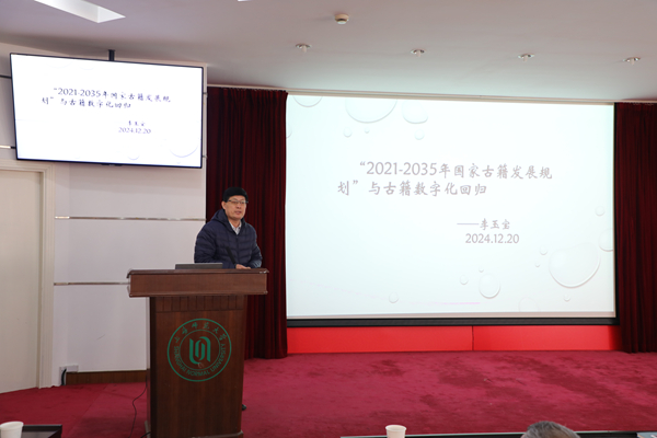 館學術委員會主任李玉寶做了題為《2021-2035國家古籍發展規劃與古籍的數字化回歸》的報告,對古籍國外流散概貌及實物回歸、影印回歸以及數字化回歸的情況進行了系統梳理,指出數字化回歸是新時代海外古籍回歸的主要形式,具有重要意義。同時,報告結合圖書館實際,提出提高古籍整理研究能力,做好經典古籍整理和活化工作的建議。