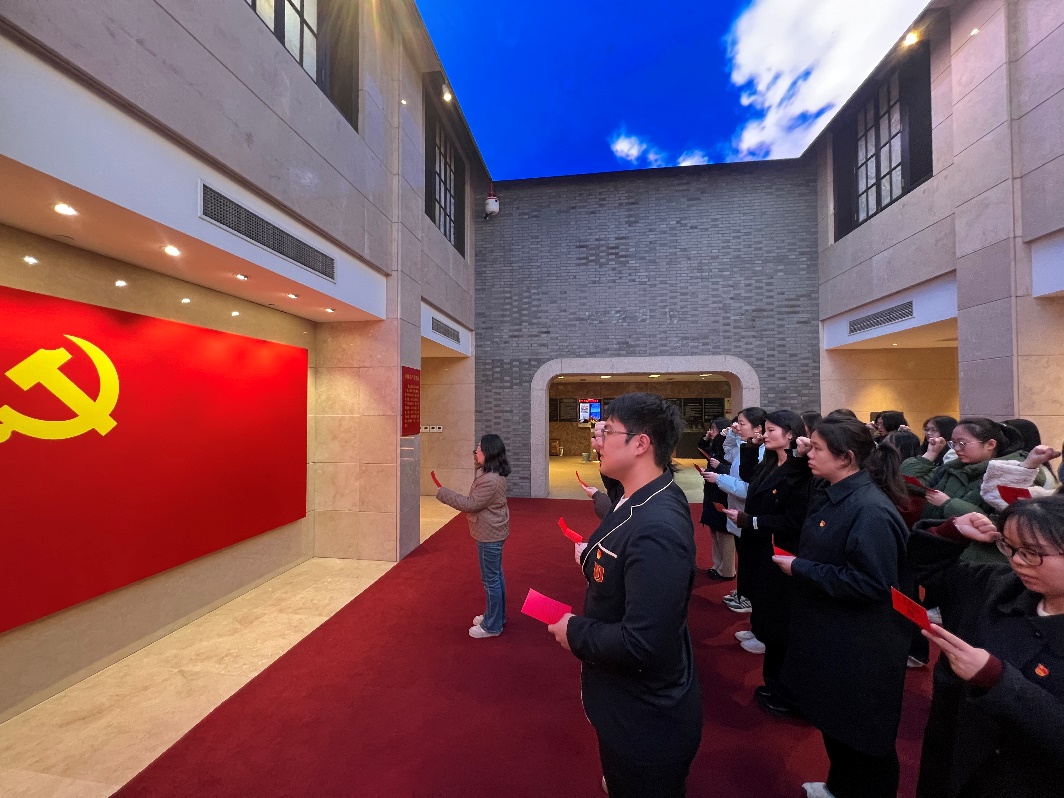 在紀念館序廳處,全體新黨員佩戴黨員徽章,聲音洪亮,滿含深情,在領(lǐng)誓人的帶領(lǐng)下,面向黨旗作莊嚴的入黨宣誓。
