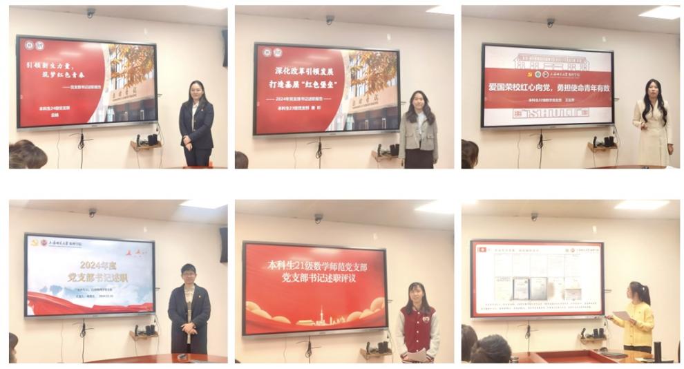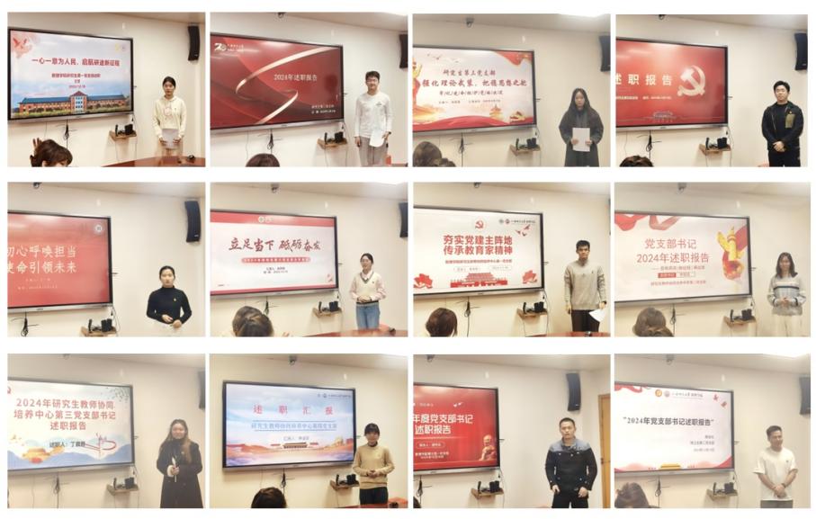 此次述職評議會有24名黨支部書記進行現場述職,其中包括6名教工黨支部書記、18名學生黨支部書記。在述職之前,各位黨支部書記均按照要求提交了書面述職報告。6名教工黨支部書記主要圍繞支部參與學院重大決策情況、政治把關作用發揮情況、師德師風建設中作用發揮情況、發展教師黨員情況,教工黨員“崗位創建”情況進行述職。教工黨支部書記講述了過去一年中支部成績與不足,表示會根據支部實際加強支部建設的規范性,著力增強支部的政治功能和組織功能,構建高質量黨建平臺。12名學生黨支部書記分別就學生政治引領和入黨啟蒙教育情況、入黨積極分子培養情況、學生黨員積分制管理落實情況,學生黨員常態化教育、“設崗定責”活動落實情況、黨員作用發揮情況進行述職。學生黨支部表示會進一步提高黨員理論學習能力,調動黨員參與支部建設的積極性,強化學生黨支部先鋒模范作用。