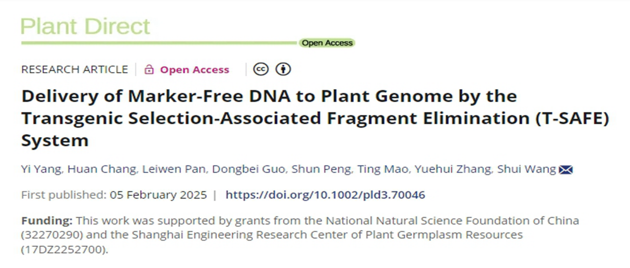 2025年2月5日,Plant Direct在線發表上海師范大學王水團隊題為“Delivery of Marker-Free DNA to Plant Genome by the Transgenic Selection-Associated Fragment Elimination (T-SAFE) System”的研究論文。該研究成功建立了一種簡單、高效且安全的方法,能夠向植物基因組遞送大片段DNA(>10 kb),為植物基因改造提供了新的技術手段。
