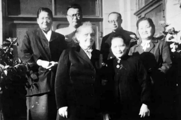圖|1955年10月,陳翰笙陪同宋慶齡(前排右)會見比利時著名和平人士伊莎貝麗·布倫姆夫人(前排左),后排左起:李德全、劉貫一、陳翰笙、史良