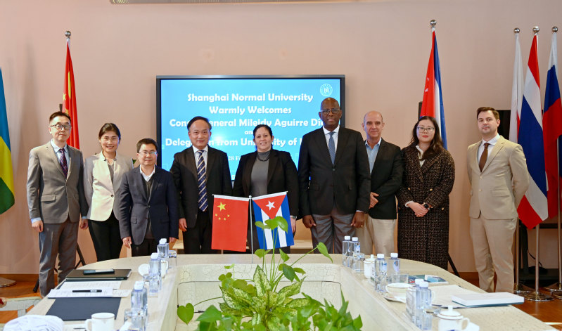 蔣明軍向梅來迪總領事和迪奧尼西奧副校長一行表示歡迎,并介紹了學校近年來在人才培養、學科特色及國際化發展方面的成果。他表示,在“一帶一路”倡議指導下,上海師范大學積極推進與拉美國家的教育交流與合作。哈瓦那大學是學校在拉丁美洲的重要合作伙伴,兩校自2023年簽署合作備忘錄以來,積極探索合作方向,在教育和科研合作等方面達成許多共識。未來,學校將重點推進馬克思主義理論研究、旅游管理、西班牙語教育等方向與哈瓦那大學的深度合作,共譜兩校教育合作新篇章。