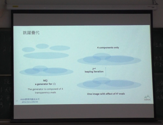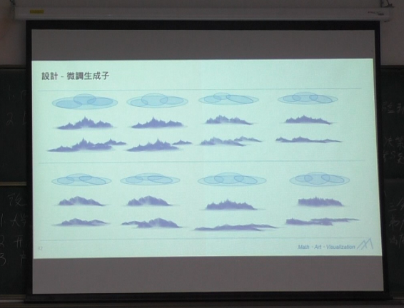 借助AMA平臺的動態可視化功能,陳明璋教授現場演示了“結構復制法”的運作邏輯:通過設定初始圖形(如一個橢圓)和遞歸規則,系統自動疊代生成山脈、丘陵和云層。而“跳躍疊代法”則進一步打破線性遞歸,允許圖形在不同維度間躍遷組合,最終形成層巒疊嶂的山水輪廓。陳明璋教授強調,AMA平臺的核心在于“將認知過程可視(式)化,既為可視,又為變式”,讓創作者直觀感知數學規律與美學表達的共生關系。
