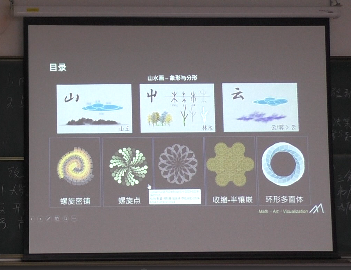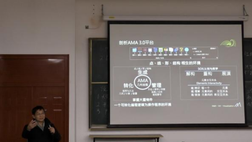 為期兩小時的報告會以數學為橋梁,帶領聽眾穿梭于邏輯與美學的雙重世界,揭示了數字化時代下藝術創作的全新可能。陳明璋教授深耕數學教育領域數十年,是數學認知理論與數字教學融合的先鋒人物。他研發的AMA軟件,將為數學教學提供更多可能性,其獨創的“結構復制法”“跳躍疊代法”更是為數學藝術開辟了新路徑。報告中,陳明璋教授以中國古典山水畫為切入點,結合AMA軟件的動態演示,利用集合作畫,展現了數學規律如何從抽象符號演變為視覺藝術,令在場師生嘆為觀止。