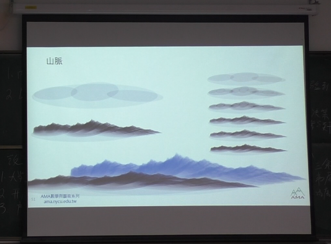 講座的高潮,是陳明璋教授展示利用AMA創作的一系列“數學山水畫”。這些作品以山水畫的構圖為基礎,卻完全由數學算法生成。令人驚嘆的是,算法甚至能模擬傳統水墨的筆觸效果——通過調整生成子的透明度,AMA可控制“虛擬筆鋒”的干濕濃淡,使其“橫看成嶺側成峰,遠近高低各不同”,因而數字作品兼具了寫意與精確的雙重特質。