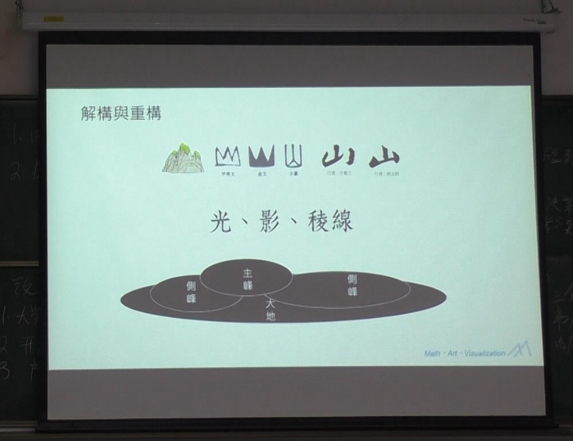 “中國文字不僅是表意符號,更蘊含著幾何與結構的數學密碼。”陳明璋教授開宗明義,指出漢字中的“生成子”(Generative Elements)是連接數學與藝術的樞紐。他以篆書中的“山”“水”二字為例,通過AMA平臺進行解構:文字的筆畫被分解為點、線、面的基礎元素,再經由算法重組,生成具有分形特征的幾何圖案。這一過程揭示了古典藝術中“師法自然”的本質——自然界的山川河流,本就遵循數學的分形與遞歸規律。