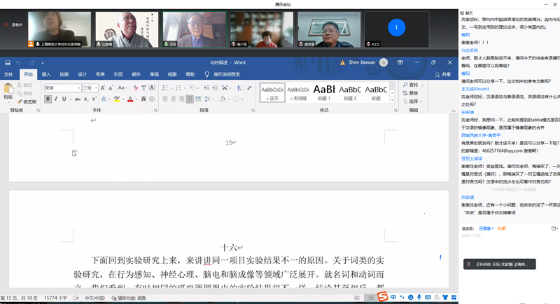 交流討論環(huán)節(jié),沈先生與線上師生積極互動。針對聽講師生聊天窗留言和語音提問,沈先生作了耐心細致的解答。聽講師生表示受益匪淺,紛紛留言感謝沈先生疫情之下為廣大語言學師生分享的真知灼見,感謝上海師范大學對外漢語搭建的學術交流平臺。