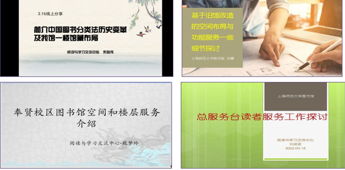這些講座中,既有對業務工作的思考和探討,如閱讀中心朱陸偉、劉淑波、唐仁、魏夢玲對藏書布局、樓層服務管理、總服務臺服務工作等的探討,資源中心石建榮、王莉萍、蔡穎、宋娜對采購模式、線上服務模式、種次號排架、舊館空間改造等的思考。