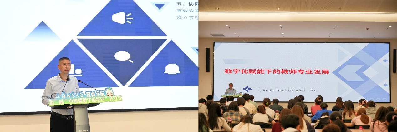 開營第一課由上海市晉元高級中學附屬學校黨總支副書記、晉元附校、西校、南校校長駱奇主講。駱奇以《數字化賦能下的教師專業發展》為題,強調師范生要“明確理想目標,做好心理準備”,并從“教學”與“班主任工作”兩個方面分享“如何做好老師”的心得。
