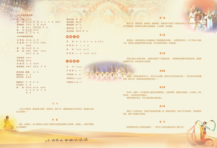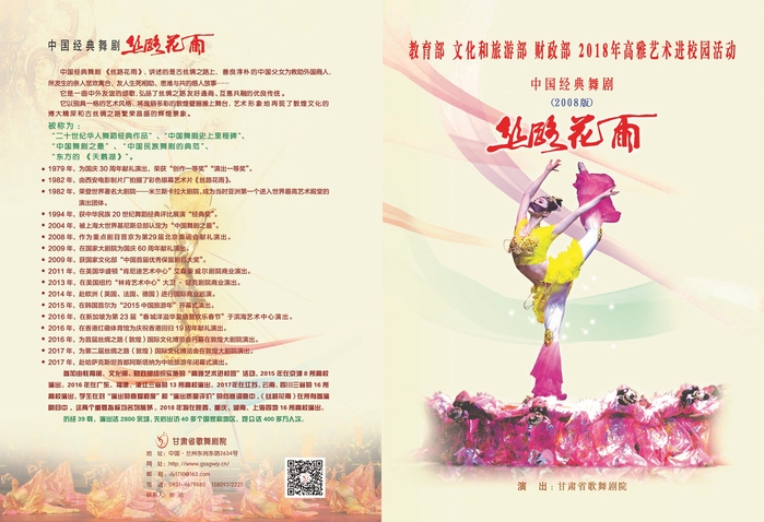 《絲路花雨》自1979年首演以來,至今已經傳承了38年,被譽為“中國民族舞劇的典范”。該舞劇以盛唐為背景,以舉世聞名的絲綢之路和敦煌壁畫為素材,博采各地民間歌舞之長,歌頌了中外人民之間的情感交流和深厚友情,弘揚了絲綢之路的友好通商、互惠共融的優良傳統。