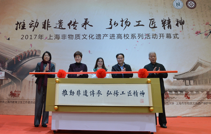 與會相關(guān)領(lǐng)導(dǎo)、非遺傳承人代表和學(xué)生代表共同推動主席臺上的操作桿,書寫著本次活動主題的卷軸徐徐展開,標(biāo)志著2017年上海非物質(zhì)文化遺產(chǎn)進(jìn)高校系列活動正式啟動。