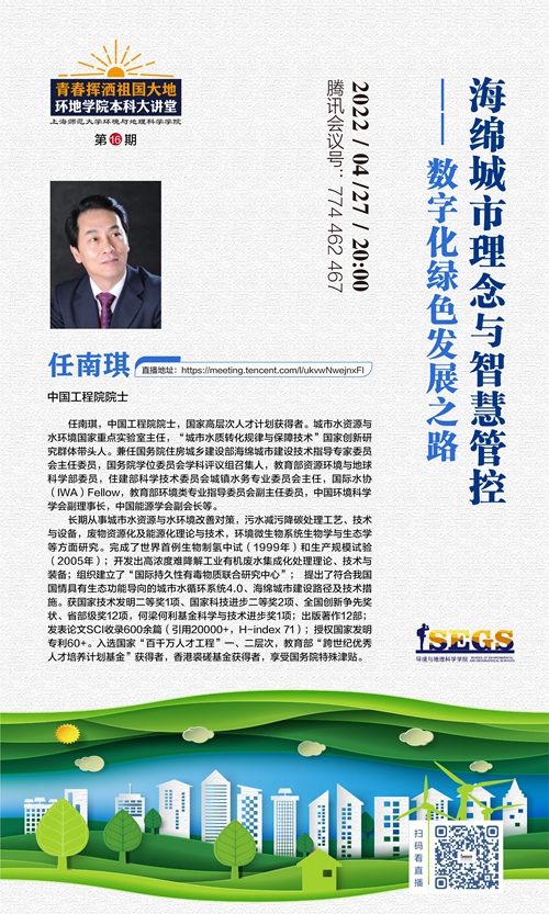 4月27日晚20時,環境與地理科學學院第16期本科生大講堂以騰訊會議和直播方式如期舉行。此次本科生大講堂邀請到中國工程院院士、國家高層次人才計劃獲得者、城市水資源與水環境國家重點實驗室主任、“城市水質轉化規律與保障技術”國家創新研究群體帶頭人任南琪教授,做題為“海綿城市理念與智慧管控——數字化綠色發展之路”的講座。講座由院長高峻主持,院黨委副書記張紅、副院長陳浮、環境工程系系主任宋佳秀老師等校內外400余名師生參加。