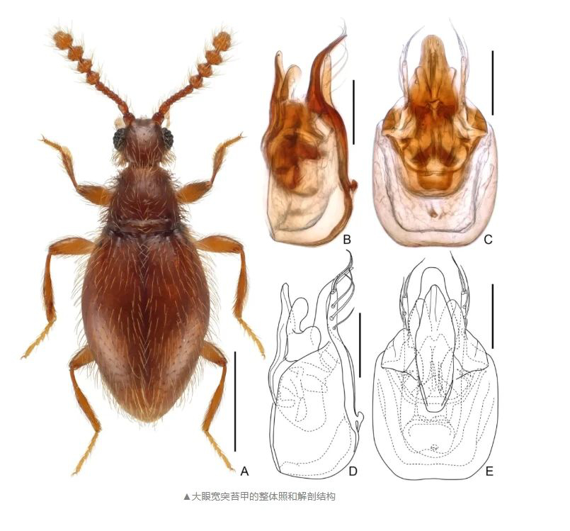 據我校生科學院科研團隊湯亮介紹,大眼寬突苔甲是一類身材迷你的微型甲蟲,體長僅1.5毫米左右,卻擁有一對醒目的大眼睛,并因此得名。憑借大眼睛,它們在陰暗的腐殖層環境中能夠敏銳地感知光線變化和周圍的動靜。借助流線型的身體,它們能夠輕松穿梭于腐殖層的縫隙和落葉之間。