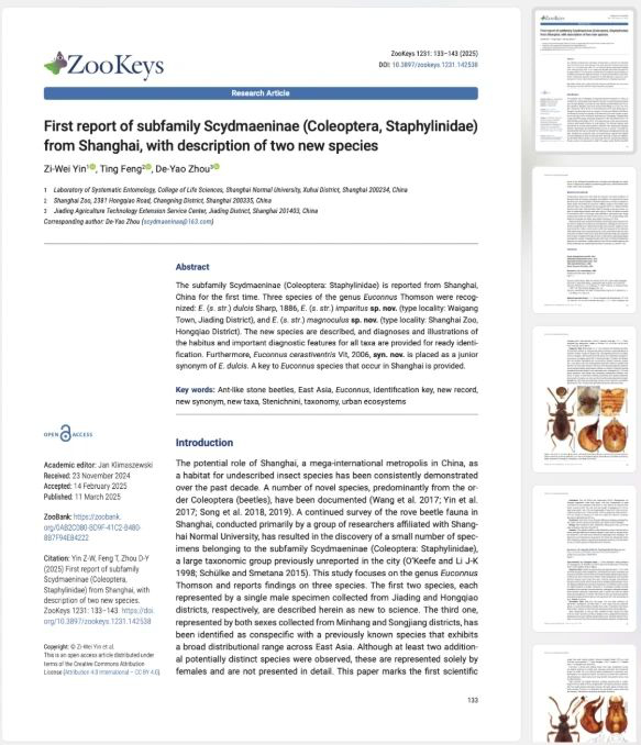 4月21日,上海動物園宣布,我校生科學院科研團隊在上海動物園發現了一個新物種——大眼寬突苔甲。這是繼西郊公園毛角蟻甲、虹橋萊甲之后,在上海動物園發現的第3個地表昆蟲新物種。近日,上海動物園與來自上海師范大學、大城小蟲工作室的昆蟲專家共同整理了采集自上海的苔甲標本,發現于上海動物園的寬突苔甲新物種——大眼寬突苔甲的研究成果已發表于國際動物分類學期刊《ZooKeys》。