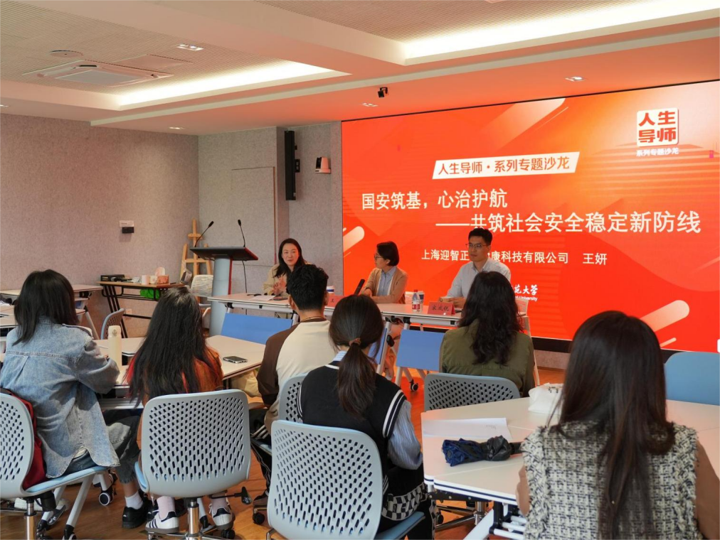 4月27日上午,心理學院人生導師主題沙龍在教苑樓D座401舉辦。活動特邀浦東新區人大代表、上海迎智正能文化發展有限公司總經理、中國生命關懷協會婚姻與家庭專業委員會委員、上海市心理學會社區心理健康與發展專業委員會副主任委員王妍擔任主講嘉賓,以《國安筑基,心治護航——共筑社會安全穩定新防線》為題,與心理學院師生分享心理學在社會治理中的實踐與思考。活動由心理學院黨委副書記、副院長吳瑋主持,上海迎智正能健康科技有限公司黨總支書記宋成銳、心理學院應用心理系副教授胡天翊一同出席本次活動。