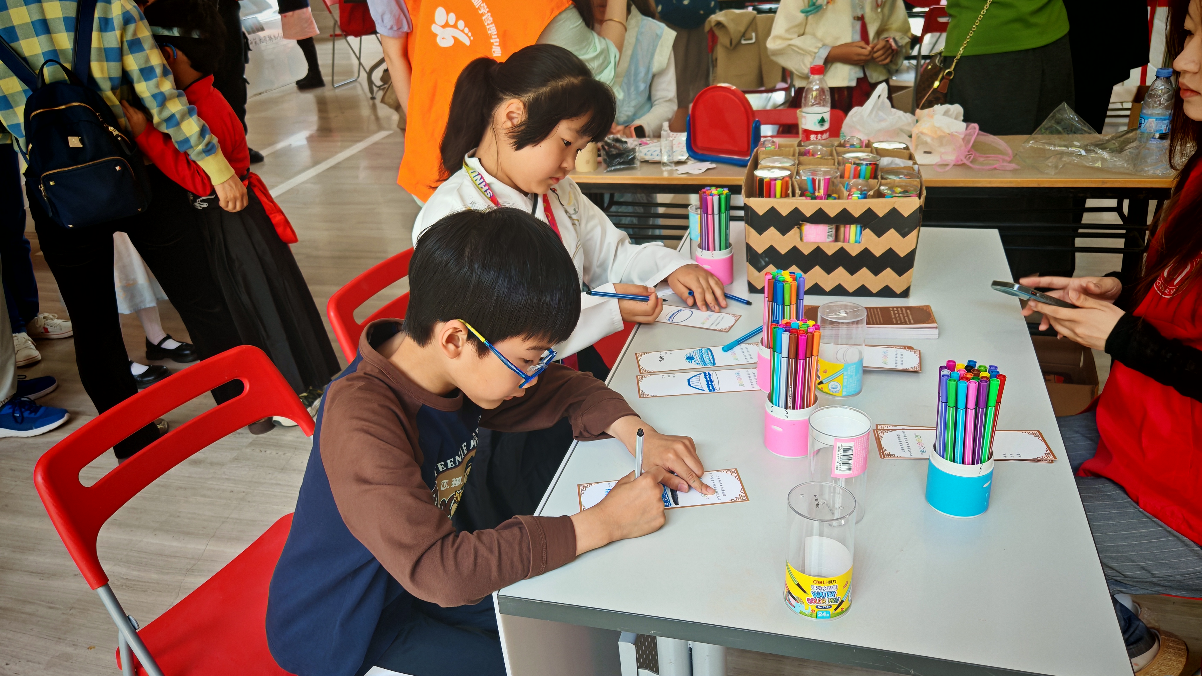 “非遺集市”活動現場以水彩為主色調,搭配國風裝飾,營造出清新靈動的氛圍。在“簽繪雅韻”區,孩子們執筆題寫詩句,將古典詩詞融入書簽設計;“妙手丹青”板塊中,陶坯彩繪、碑帖傳拓等非遺技藝吸引眾多小藝術家駐足,一幅幅稚趣盎然的作品詮釋著傳統工藝的新生;“霓裳羽衣”展區則化身漢服秀場,身著紅綠襦裙的小演員們翩然起舞,朱漆發冠與團扇搖曳生姿,帶領觀眾穿越千年時光。