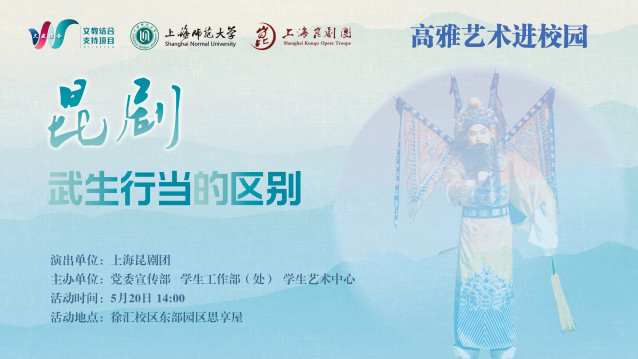 上海昆劇團二級演員季云峰將向觀眾普及何為昆曲、昆曲的由來、昆曲的行當等,尤其會著重介紹武生行當與服裝展示,并向觀眾展演經典劇目片段,深入淺出地解析其中劇情及看點,觀眾更有機會現場體驗互動。