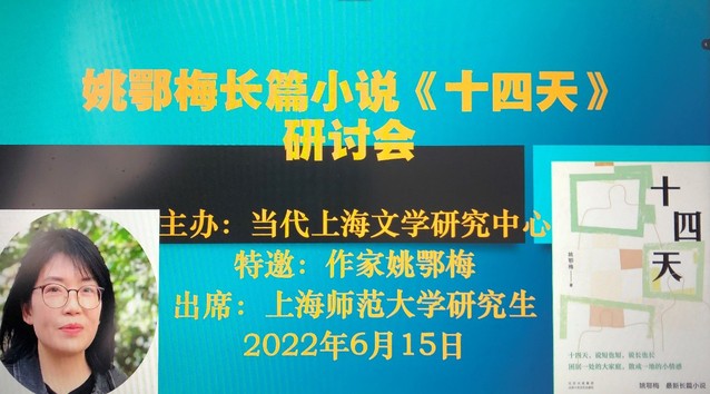 上海作家姚鄂梅是當(dāng)代文壇一位實(shí)力派作家,已發(fā)表了百余篇中短篇小說、出版了11部長篇小說。她在新冠疫情期間發(fā)表了長篇小說《十四天》(載《收獲》雜志 2021 年第 3 期)。2022年6月15日,上海師范大學(xué)人文學(xué)院舉辦姚鄂梅長篇小說《十四天》研討會(huì),作家姚鄂梅女士應(yīng)邀與會(huì)。研討會(huì)由博士生導(dǎo)師楊劍龍教授主持,人文學(xué)院中國現(xiàn)當(dāng)代文學(xué)專業(yè)已畢業(yè)的博士郝瑞娟、黃明海、劉虎、萬士端,在讀的博士研究生徐國慶、羅敏儀、韓越、豐明啟、尚子婉,碩士研究生虞濤、廖迎鑫、董斯杰、李揚(yáng)、孫麗麗、李靜嫻、吳倩、廖亞婕、董影等參與了研討。