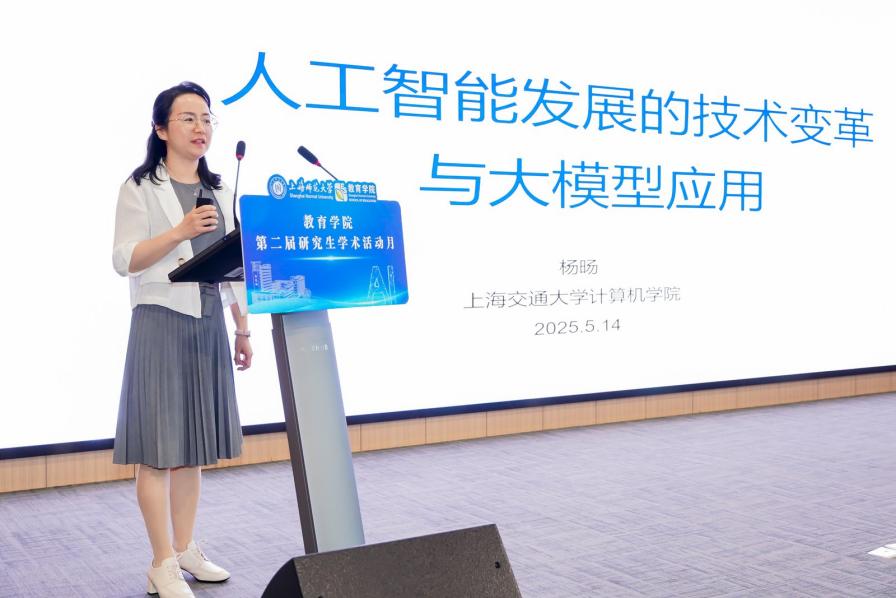 開幕式后,楊旸教授作“人工智能發(fā)展的技術(shù)變革與大模型應用”主題報告。楊教授在機器學習、數(shù)據(jù)挖掘等領(lǐng)域成果卓越,她系統(tǒng)梳理人工智能發(fā)展脈絡(luò),深入解讀技術(shù)變革趨勢與大模型應用前景,為師生后續(xù)開展相關(guān)研究拓寬視野、提供創(chuàng)新思路與實用方法論。