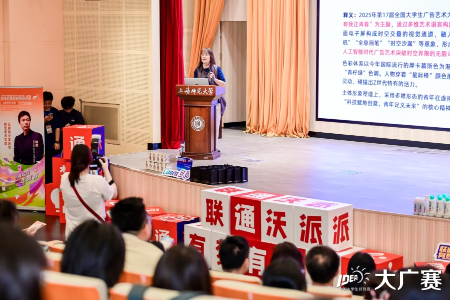 上海賽區負責人鄭歡對第17屆大廣賽的口號“創意有我正青春”進行了解讀,然后對上海賽區第16屆大廣賽的獲獎情況進行了分析與介紹。鄭歡教授指出,去年上海賽區獲獎作品達到1274份,其中長文案類、微電影類、廣告語類增勢尤為明顯;科技類屬于2024年新增創作類別,首次參賽即獲 77.78% 的高獲獎率。但動畫類、互動類以及廣播類呈下降趨勢。較上年相比,24年上海賽區獲獎作品總量有所減少,營銷創客類獲獎數量較去年增幅最大,呈現出各高校廣告專業的轉型跡象,上海師范大學、上海理工大學、上海工程技術大學等高校在平面類、IP 與周邊類、廣播類等領域表現突出,展現出鮮明的學校特色。最后,鄭歡教授對第17屆大廣賽的變化以及賽程安排進行了進度解讀,有效地回答了同學們關于本屆大廣賽的一些疑問。
