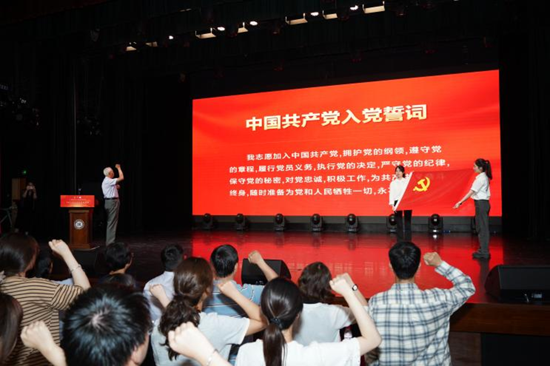 在教育學院特邀黨建組織員謝利民老師的帶領下,全體黨員起立,莊嚴重溫入黨誓詞。鏗鏘有力的誓言回蕩在音樂廳內,提醒著各位黨員同志始終牢記入黨時的錚錚誓言,做一名無愧于黨和人民的合格黨員。