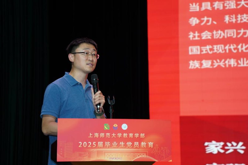 心理學院青年教師李海江副教授為畢業生帶來專題黨課《青年挺膺擔當,奮進教育強國新征程》,闡述了教育作為國之大計、黨之大計的重要意義。他寄語畢業生黨員,作為教育學部的學子,要肩負為黨育人、為國育才 的光榮使命,希望同學們深刻認識到青年黨員在教育強國建設中的重要使命,以挺膺之姿投身教育事業。
