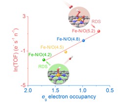 研究表明,鐵活性位點(diǎn)的eg電子占據(jù)數(shù)對(duì)Fe-N-C催化劑的反應(yīng)活性具有決定性作用。通過(guò)調(diào)控氮/氧配位結(jié)構(gòu)和電子結(jié)構(gòu),制備了一系列有序介孔碳負(fù)載的鐵單原子催化劑(Fe-N/O(n)/OMC,n代表Fe-N/O配位數(shù)),并利用鐵K邊和L邊X射線吸收近邊結(jié)構(gòu)譜(XANES)表征了eg電子占據(jù)數(shù),發(fā)現(xiàn)可作為Fe-N-C催化劑的有效活性描述符。當(dāng)eg電子占據(jù)數(shù)為0.7時(shí)(Fe-N/O(5.2)/OMC),催化劑通過(guò)削弱氧中間體的強(qiáng)吸附作用,將速率決定步驟(RDS)從*OH脫附轉(zhuǎn)變?yōu)?OOH形成。該催化劑的轉(zhuǎn)換頻率(TOF)達(dá)到Fe-N/O(4.2)/OMC(eg占據(jù)數(shù)1.7)的28倍,半波電位從0.84 V(vs. RHE)提升至0.94 V,質(zhì)量活性為商業(yè)Pt/C的6.3倍。這一研究發(fā)現(xiàn)為通過(guò)雜原子配位或異質(zhì)金屬位點(diǎn)等策略設(shè)計(jì)新型鐵活性中心提供了重要指導(dǎo)。