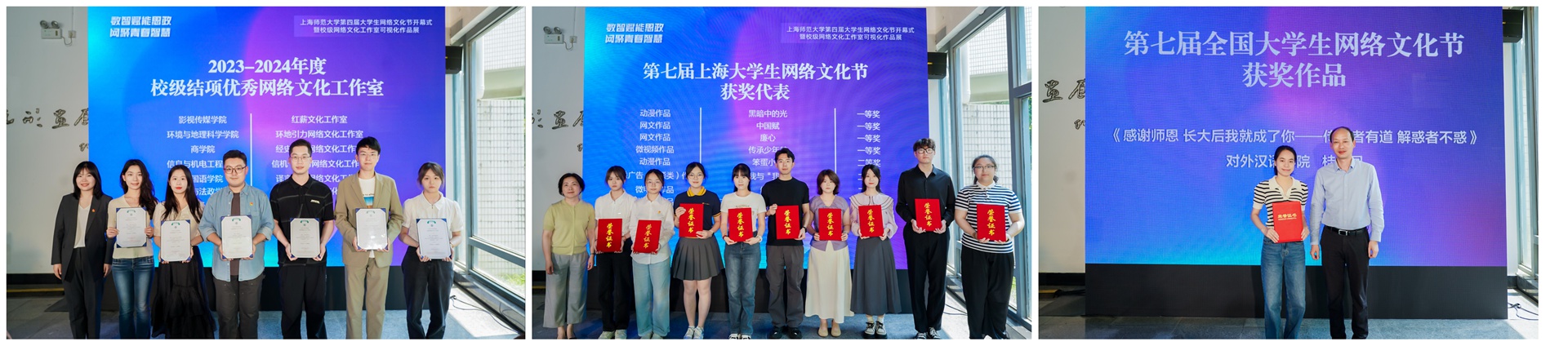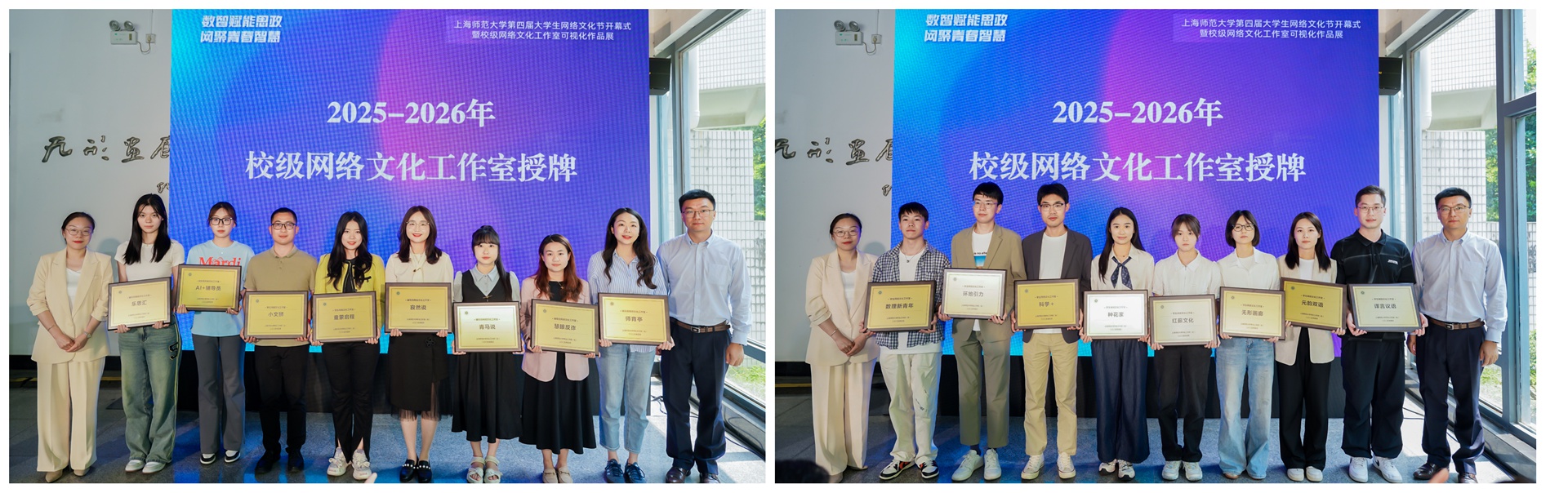 活動現場還對2023-2024年度校級優秀結項網絡文化工作室、第七屆全國和上海大學生網絡文化節獲獎代表進行表彰。同時,為2025-2026年度16個校級網絡文化工作室進行授牌。