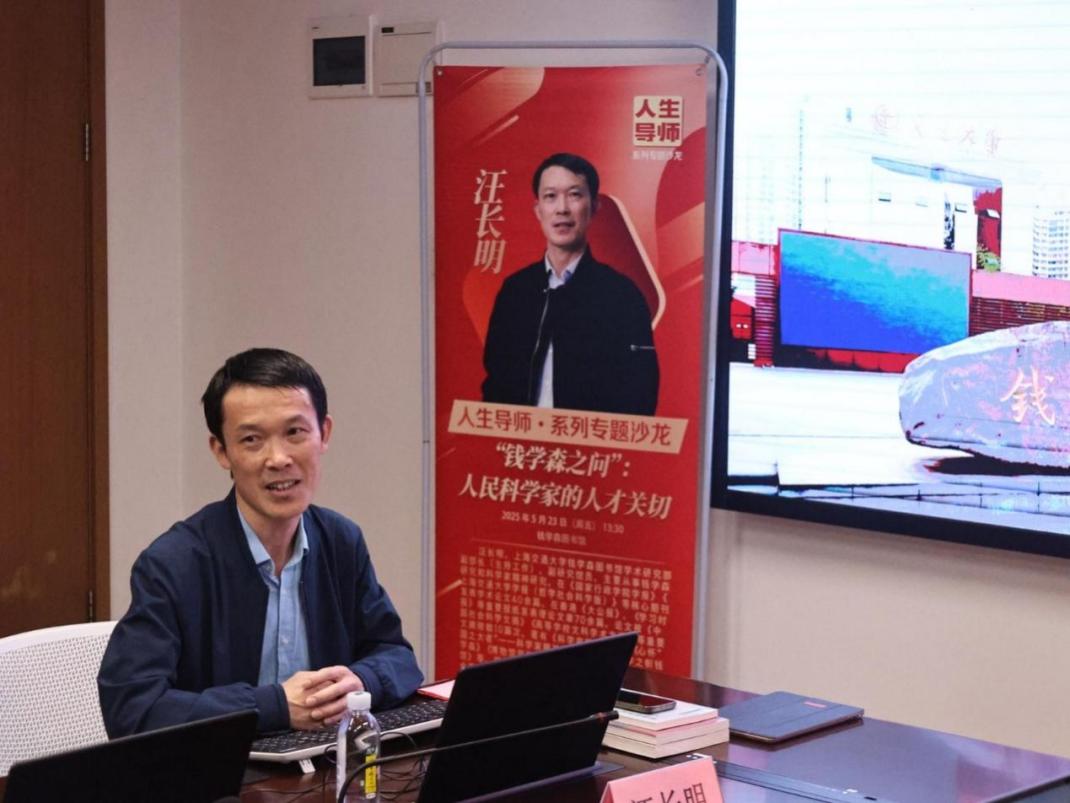 隨后,汪長明老師以“‘錢學森之問’:人民科學家的人才關切”為主題為師生做講座。汪老師從“錢學森之問”的肇始之源講起,從“中國發展階段論”“人才培養主體論”“人才培養目標論”“大學辦學特色論”“人才成長規律論”五重思考,層層解析“錢學森之問”題中之義,強調了“科學技術發明創造人才”不僅是當下我國教育領域的核心議題,更是關乎我國長遠發展的戰略命題。汪老師結合自身研究,提出“錢學森之問”的破困之道,并向同學們寄語:“社會主義建設需要更多的錢學森,國家才會有大的發展”。他號召同學們以時代為卷、以青春作筆,主動回應“錢學森之問”,永葆獨立思考的鋒芒,將科學家精神落實到學習和生活中,“每個人都能成為破題者,每一個人都能成為答案!”