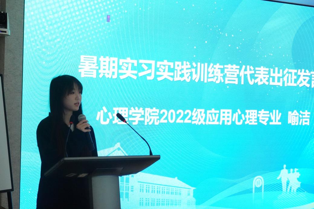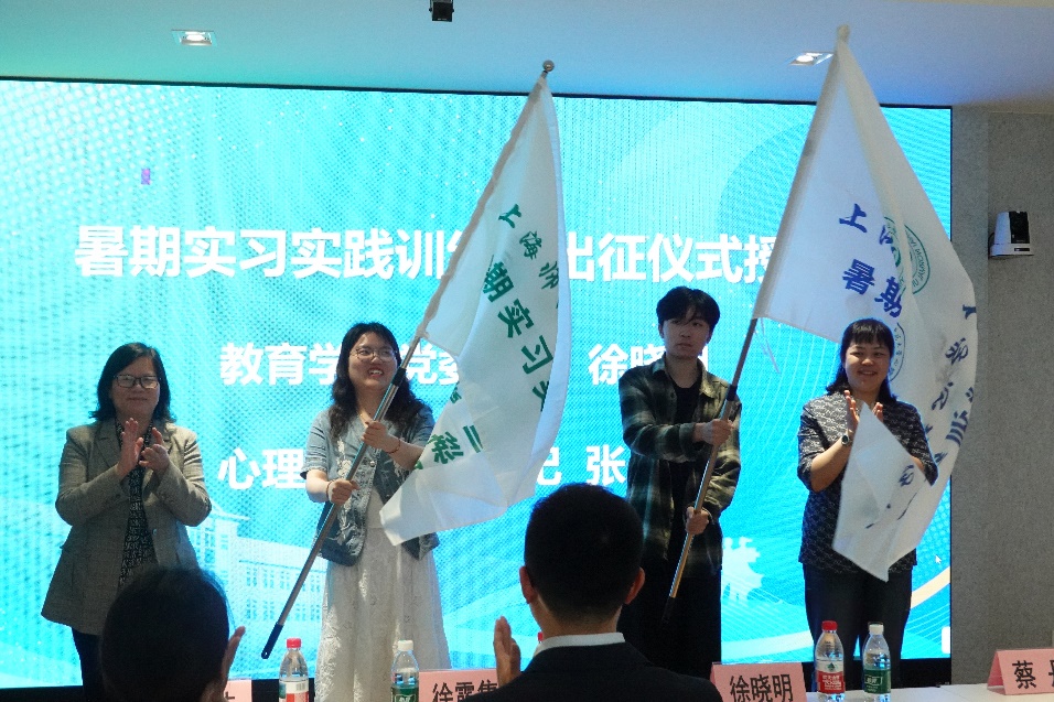 儀式上,教育學院黨委書記徐曉明、心理學院黨委書記張益為暑期實習實踐訓練營代表授旗,心理學院應用心理專業喻潔作為即將踏上實習崗位的學生代表發表出征宣言,展現了青年學子投身實踐、錘煉本領的決心。