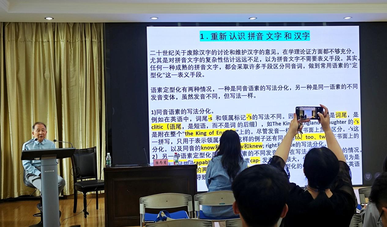 在互動問答環節,與會師生就漢字拼音化、“一語兩文”在教學上的可行性等問題展開深入探討。陸教授的講座不僅加深了大家對拼音文字的認識,也為今后的漢語教學與研究提供了新的視角。