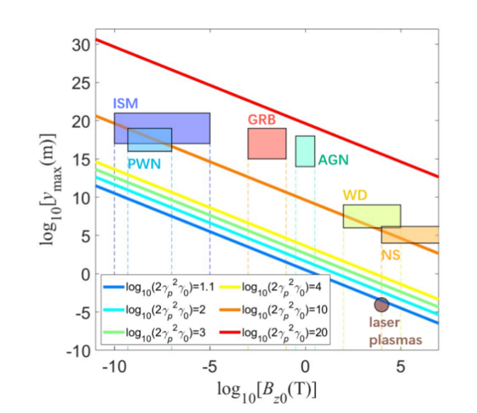 上圖為質子最大加速距離與初始磁場強度的關系以及最大能量。線條表示質子最大加速距離y_max與磁場強度B_z0的關系,假定天體的速度為v_p=0.925。彩色區域顯示了星際物質(ISM)、脈沖星風星云(PWN)、伽馬射線暴(GRB)、活動星系核(AGN)、白矮星(WD)和中子星(NS)等天體的典型磁場強度和距離范圍。