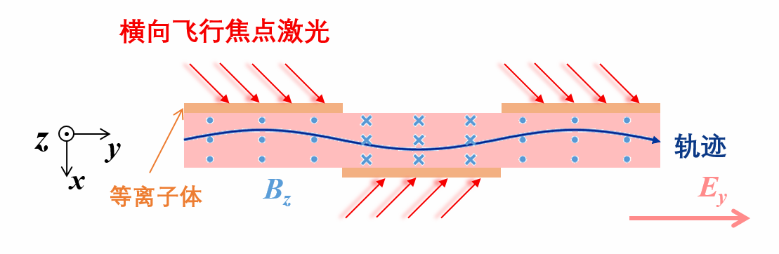 (可采用橫向飛行焦點激光作為驅動源,磁場方向需根據粒子的運動方向進行改變,以確保橫向電場始終沿y方向)