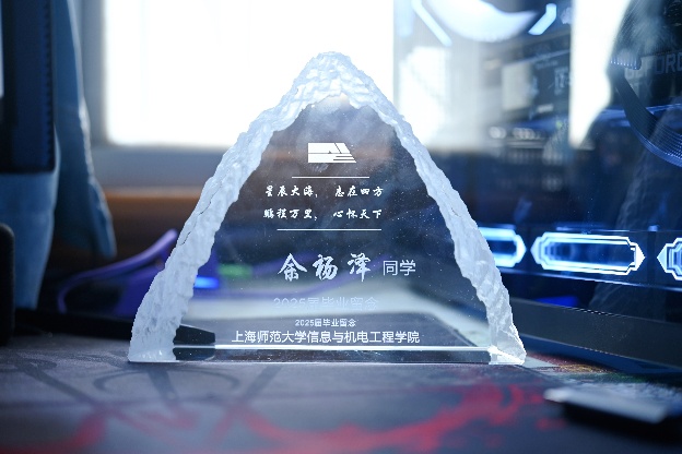 最令人動容的一幕是畢業贈禮環節。學院為每一位同學準備了兩份特別贈禮。一個是由輔導員團隊秘密籌備的“云端家書”。為打造這份跨越山海的驚喜,輔導員老師提前聯系每位學生家長,精心收集了來自天南海北的家庭祝福視頻,話語樸實卻飽含深情,“學有所成,將來更好地回報社會”“感謝上海師范大學把你培養得這么優秀,你是我們的驕傲”“愿你懷揣熱忱,奔赴遠方”這些帶著鄉音的告白,讓熱烈的掌聲和激動的淚水一齊迸發。每一幀畫面、每一句叮嚀都凝聚著父母對子女的牽掛與期許,為畢業生們鐫刻下母校與家庭共同編織的永恒記憶。第二份贈禮是印有每個人名字的“勇攀高峰”畢業紀念碑,并為同學們送上最真摯的祝福語——“星辰大海,志存高遠,鵬程萬里,心懷天下”。學院領導為畢業生頒發紀念禮品,并與全體人員合影留念。鏡頭定格的瞬間,既有畢業生們對未來的憧憬,也有師生間難舍的情誼,更有家與校共同編織的溫情記憶。