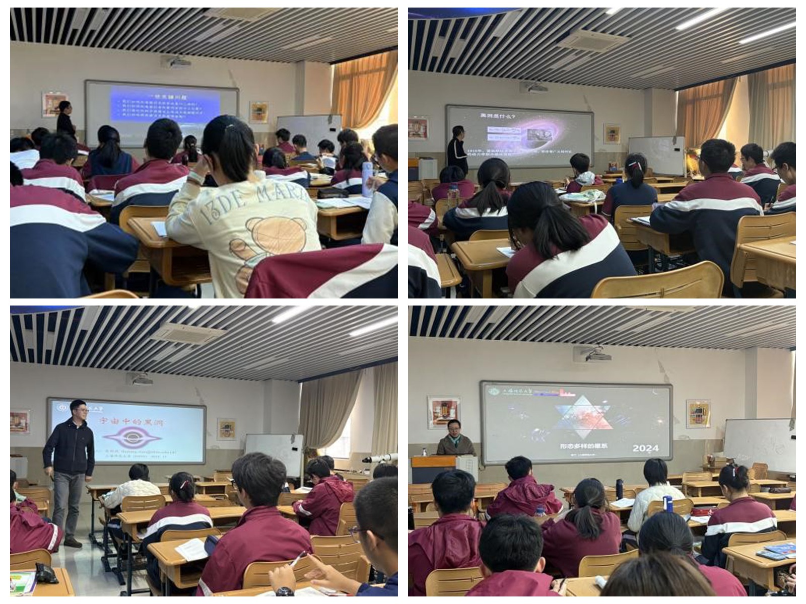 自2024年9月至2025年5月,12位專家學者共帶來25場專題講座,內容不僅覆蓋宇宙演化、天體物理、深空探測等核心主題,還融合了中國航天成就(如探月工程、“天問一號”)與前沿交叉技術(如AI、計算機模擬等),構建了一個全景式的宇宙認知體系。課程內容緊扣科學前沿,羅智堅教授引領學生縱覽《天文學簡史》,揭開《黑洞與引力波》的深奧奧秘,并在第二學期深化講授《天文學簡史Ⅱ》;方偉教授帶領大家思考《宇宙的過去、現在與未來》,探索《星空的奧秘》,并展望《生命及地球外文明》的可能性;杜偉副研究員深入淺出地講解《宇宙學距離:理論與觀測》,并在第二學期闡釋《引力透鏡》的神奇現象。張少華研究員以親身經歷分享《冰海尋星-南極天文觀測》,并在第二學期講授《尋找外星人》的科學探索前沿;常伊人博士詳解《科學實現月球探測》,并生動講述《火星“天問一號”探測任務的“所見所聞”》;唐雨平副教授描繪了《我們的銀河系》家園,并在第二學期介紹《多波段天文觀測》的技術原理;肖胡兵副教授帶大家領略了《宇宙中的黑洞》的壯闊景象;陳竹副研究員展示了《形態多樣的星系》,并揭示了如何利用《AI與天文數據》開展《解密宇宙》的實踐。此外,李智副教授講授《計算機中的天體物理》應用,并在第二學期追溯《暗物質的前生今世》;劉道軍研究員介紹了《極早期宇宙簡介》,并進一步闡述《宇宙大爆炸》理論。石卉副教授講解了《光學與天文探測》的緊密聯系。科普作家孫正凡博士從歷史視角解析《歷法和古代宇宙學》,引導學生進行《太陽系探索》,并剖析《天體物理學里的原子和元素》。