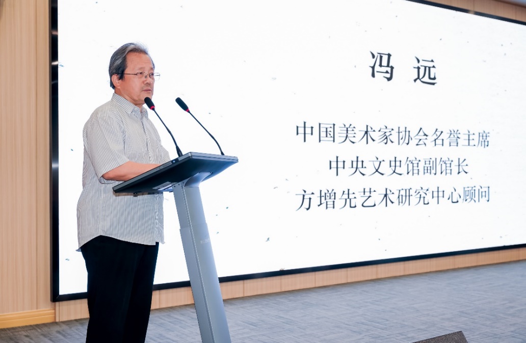 馮遠在致辭中以一位得到方增先老師提攜教誨的學生的身份向中心的成立表示熱烈祝賀,并向給予中心成立大力支持的學校領導和付出辛勤努力的同仁們表示敬意和感謝。馮老師談道,作為國內第一個方增先藝術研究中心,它的成立是貫徹落實習近平文化思想、增強文化自信、社會主義文化藝術守正創新、社會主義藝術創作和藝術事業發展的重要舉措。方增先先生是中國現代杰出的畫家,新浙派畫派的奠基人,德藝雙馨,他的藝術成就和歷史貢獻成為鐫刻在新中國美術歷史上的豐碑。希望中心能堅定初心宗旨、傳承方先生的藝術精神,激發其藝術創新在當下煥發出的活力作用于當代藝術創新發展,為中國人物畫的未來發展再創華章。